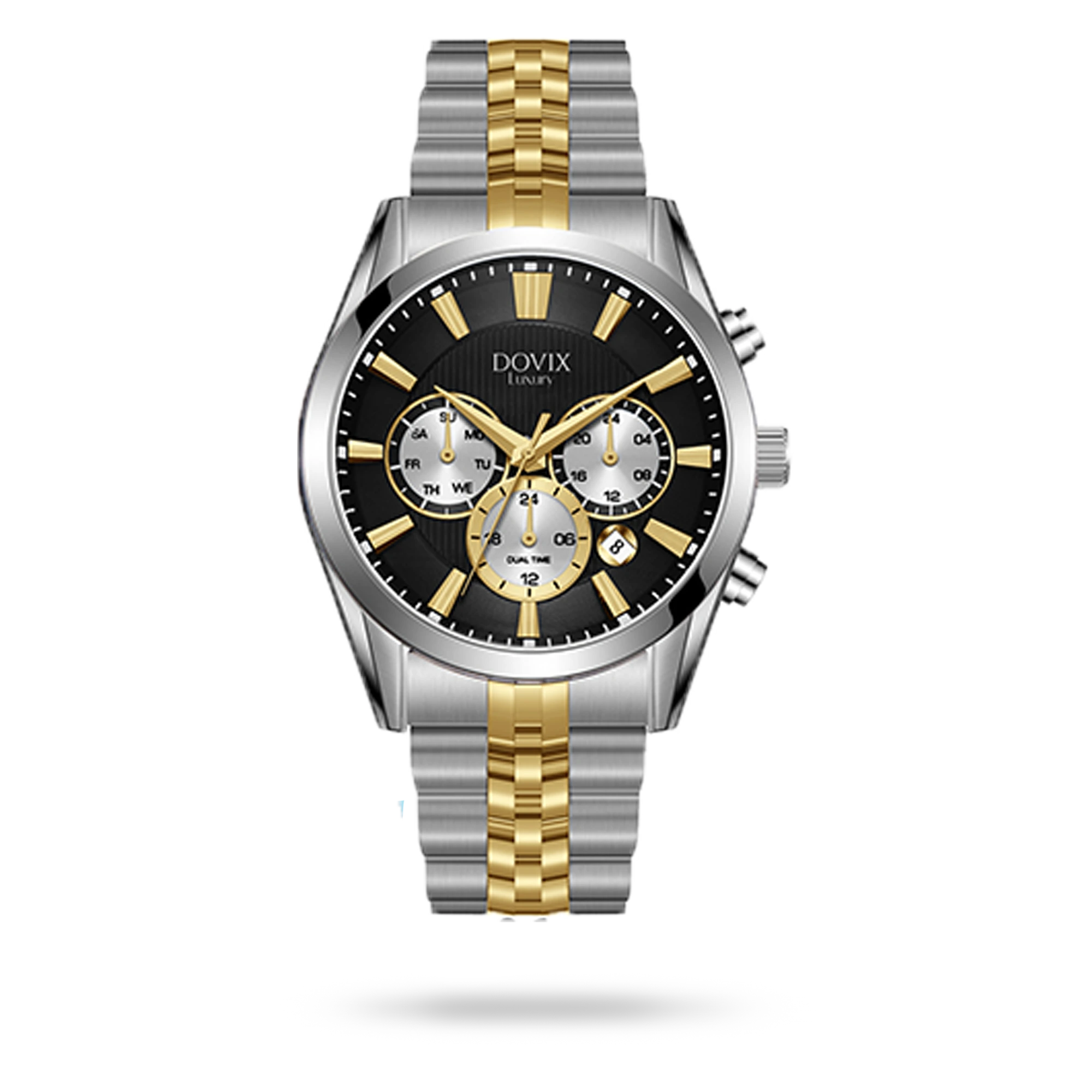 ساعت مچی Dovix مردانه ساخت آلمان، با بدنه‌ای به رنگ دو رنگ طلایی و بندی به رنگ دو رنگ طلایی که جلوه‌ای چشم‌نواز و خاص ایجاد می‌کند. صفحه این ساعت به رنگ مشکی طراحی شده که هارمونی بی‌نظیری با سایر اجزای ساعت دارد. این مدل در دسته ساعت‌های کرنوگراف قرار می‌گیرد و به صورت تک تولید شده است. برند آلمانی Dovix با استفاده از بهترین متریال و دقت مهندسی مثال‌زدنی، ساعتی را خلق کرده که نه‌تنها بیانگر سلیقه‌ای خاص، بلکه همراهی ماندگار برای سال‌ها خواهد بود.
