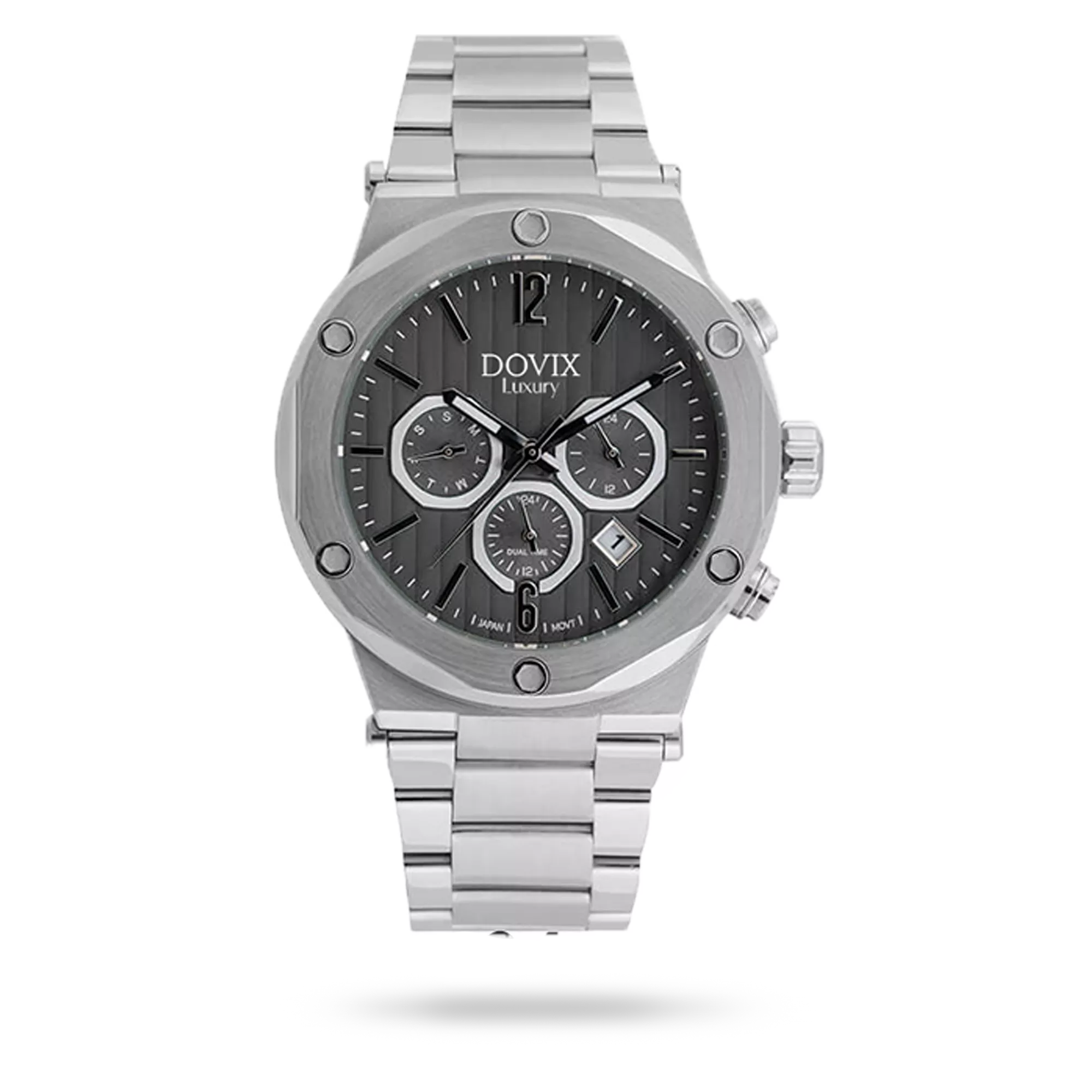 ساعت مچی Dovix مردانه ساخت آلمان، با بدنه‌ای به رنگ سیلور و بندی به رنگ سیلور که جلوه‌ای چشم‌نواز و خاص ایجاد می‌کند. صفحه این ساعت به رنگ گان طراحی شده که هارمونی بی‌نظیری با سایر اجزای ساعت دارد. این مدل در دسته ساعت‌های کرنوگراف قرار می‌گیرد و به صورت تک تولید شده است. برند آلمانی Dovix با استفاده از بهترین متریال و دقت مهندسی مثال‌زدنی، ساعتی را خلق کرده که نه‌تنها بیانگر سلیقه‌ای خاص، بلکه همراهی ماندگار برای سال‌ها خواهد بود.