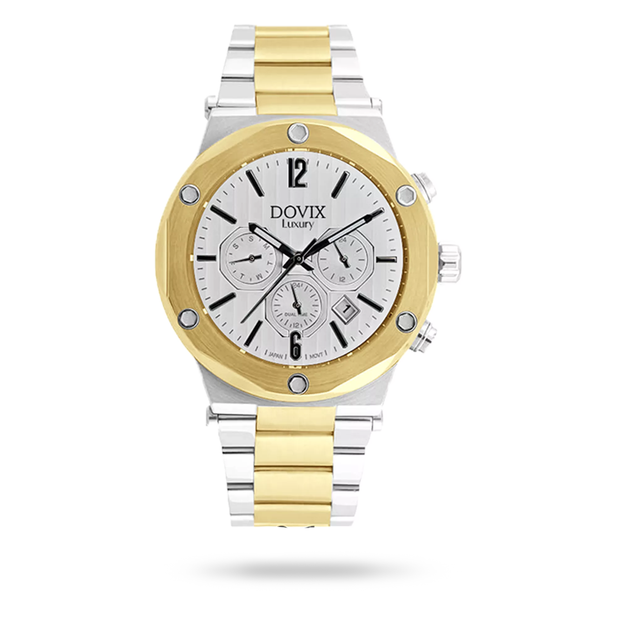 ساعت مچی Dovix مردانه ساخت آلمان، با بدنه‌ای به رنگ دو رنگ طلای و بندی به رنگ دو رنگ طلای که جلوه‌ای چشم‌نواز و خاص ایجاد می‌کند. صفحه این ساعت به رنگ سفید طراحی شده که هارمونی بی‌نظیری با سایر اجزای ساعت دارد. این مدل در دسته ساعت‌های کرنوگراف قرار می‌گیرد و به صورت تک تولید شده است. برند آلمانی Dovix با استفاده از بهترین متریال و دقت مهندسی مثال‌زدنی، ساعتی را خلق کرده که نه‌تنها بیانگر سلیقه‌ای خاص، بلکه همراهی ماندگار برای سال‌ها خواهد بود.