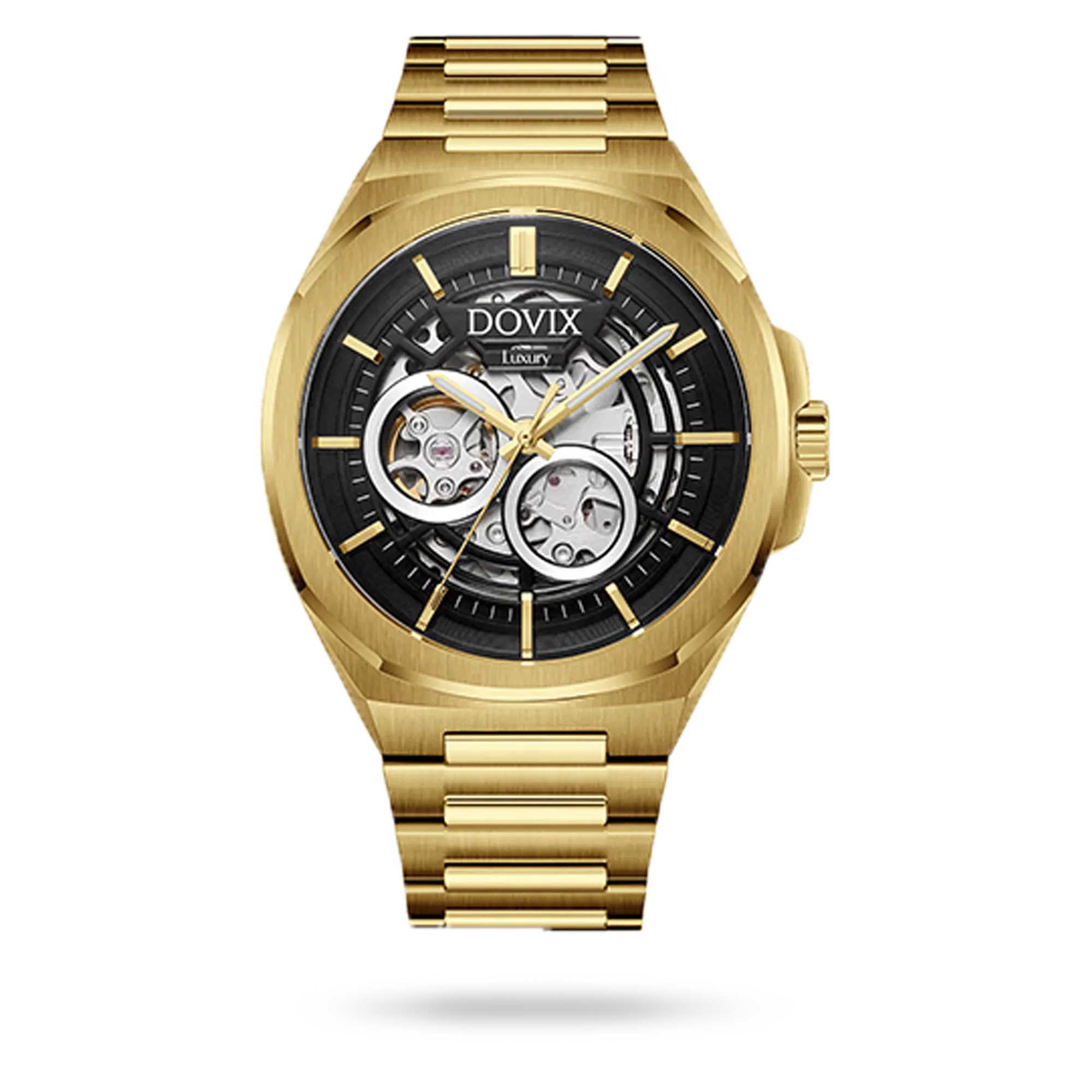 ساعت مچی Dovix مردانه ساخت آلمان، با بدنهای به رنگ طلایی و بندی به رنگ طلایی که جلوهای چشمنواز و خاص ایجاد میکند. صفحه این ساعت به رنگ مشکی طراحی شده که هارمونی بینظیری با سایر اجزای ساعت دارد. این مدل در دسته ساعتهای اتوماتیک قرار میگیرد و به صورت تک تولید شده است. برند آلمانی Dovix با استفاده از بهترین متریال و دقت مهندسی مثالزدنی، ساعتی را خلق کرده که نهتنها بیانگر سلیقهای خاص، بلکه همراهی ماندگار برای سالها خواهد بود.