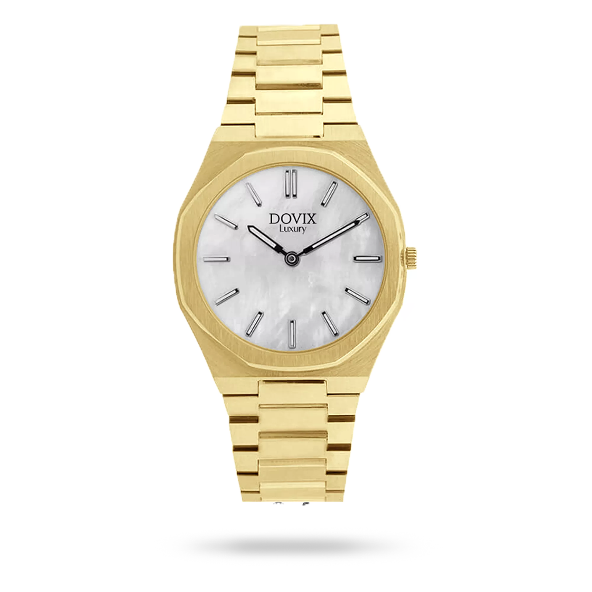 ساعت مچی Dovix زنانه ساخت آلمان، با بدنه‌ای به رنگ طلایی و بندی به رنگ طلایی که جلوه‌ای چشم‌نواز و خاص ایجاد می‌کند. صفحه این ساعت به رنگ سیلور طراحی شده که هارمونی بی‌نظیری با سایر اجزای ساعت دارد. این مدل در دسته ساعت‌های کلاسیک قرار می‌گیرد و به صورت تک تولید شده است. برند آلمانی Dovix با استفاده از بهترین متریال و دقت مهندسی مثال‌زدنی، ساعتی را خلق کرده که نه‌تنها بیانگر سلیقه‌ای خاص، بلکه همراهی ماندگار برای سال‌ها خواهد بود.